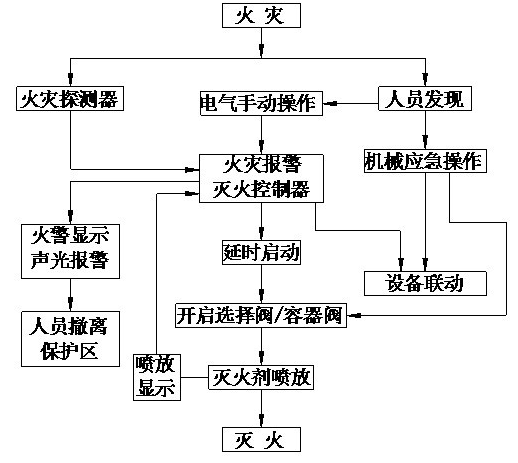 當(dāng)兩種探測器發(fā)出火災(zāi)信號時,控制主機啟動警鈴和聲光報警器,聯(lián)動關(guān)閉防護區(qū)開口,進入滅火啟動延時,達到設(shè)定的延時時間后,自動啟動滅火系統(tǒng)。